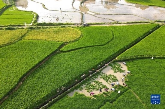 7月11日,在湖南省婁底市雙峰縣井字鎮(zhèn)花山村,農(nóng)民在田間起秧(無人機(jī)照片)。