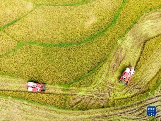 7月10日,在湖南省永州市道縣四馬橋鎮(zhèn)金獅庵村,農(nóng)民駕駛農(nóng)機(jī)在田間收割早稻(無人機(jī)照片)。