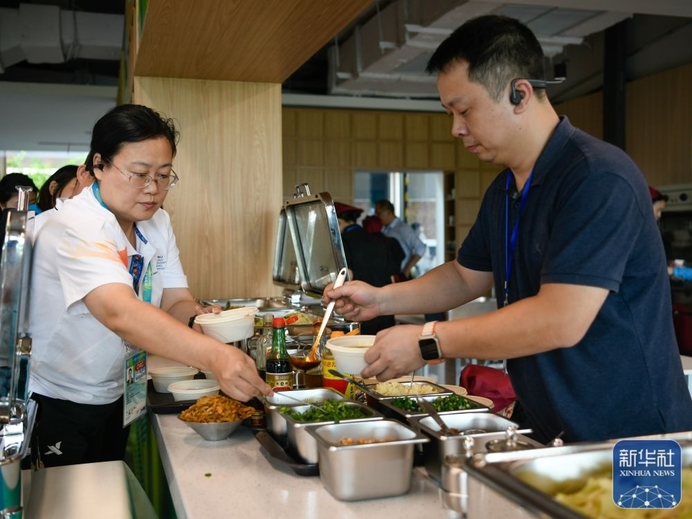 ↑7月14日,工作人員在成都大運會主媒體中心媒體餐廳內就餐。新華社記者 胥冰潔 攝