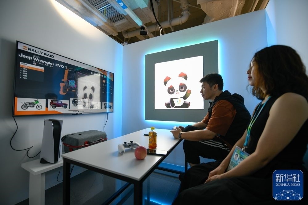 ↑7月14日,媒體工作人員在成都大運會主媒體中心休閑娛樂區(qū)內游玩。新華社記者 胥冰潔 攝