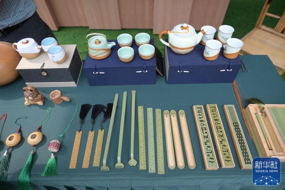 ↑?這是7月12日拍攝的主媒體中心傳統(tǒng)文化傳播區(qū)的四川竹編產品展示。新華社發(fā)(魏麟瀟攝)