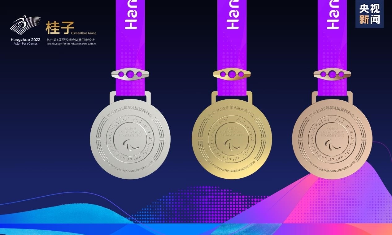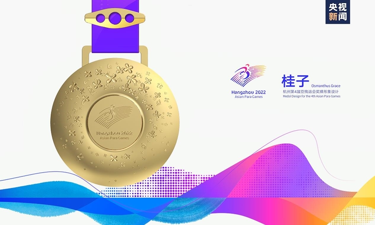 “桂子即桂花,素有金桂銀桂之分,暗合金牌銀牌?!睋?dān)任獎(jiǎng)牌設(shè)計(jì)團(tuán)隊(duì)主要負(fù)責(zé)人的中國(guó)美術(shù)學(xué)院工業(yè)設(shè)計(jì)副教授周波表示,“桂花是杭州市花,在丹桂飄香的金秋十月,我們相聚在杭州,整個(gè)城市都因它的綻放而香氣撲鼻。我覺(jué)得桂花是最好的意象表達(dá),漫天飛舞、靈動(dòng)飛逸的桂花飄灑在亞殘運(yùn)會(huì)會(huì)徽周?chē)恳涣⒙涞墓鹱泳秃帽葰埣策\(yùn)動(dòng)員奮勇向前,挑戰(zhàn)自我而獲得的一枚枚獎(jiǎng)牌。”