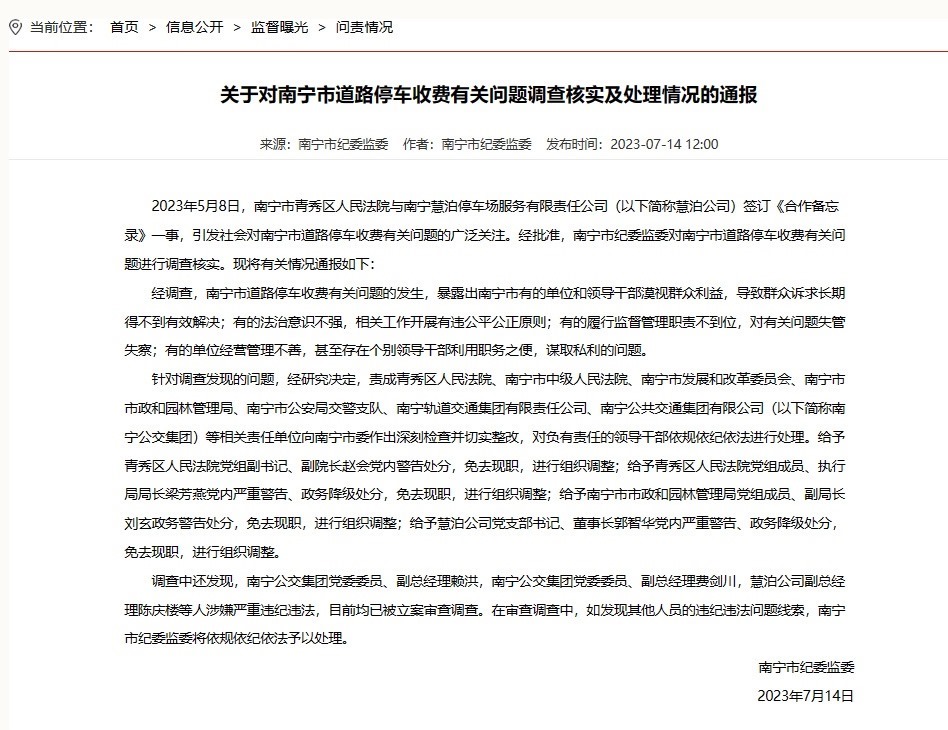 ·南寧通報道路停車收費(fèi)有關(guān)問題處理情況:4人被免職。