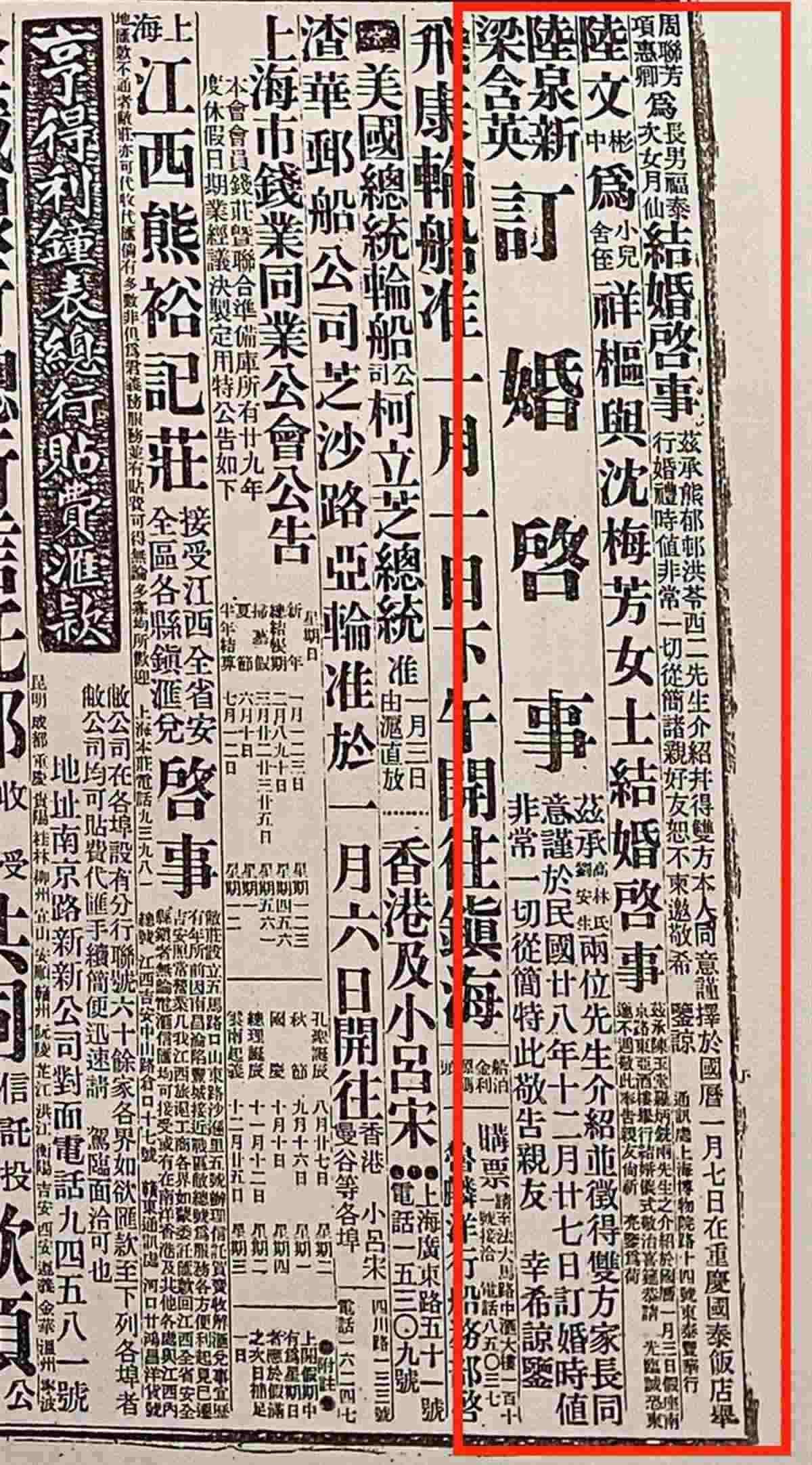 據(jù)了解,登報結(jié)婚最早在民國風(fēng)行。當(dāng)時,婚姻法和婚姻登記制度并不完善,于是結(jié)婚時在報紙上公示成為一種約定俗成的習(xí)慣。一來知會了遠(yuǎn)近親友,二來有一定法律效力,日后可以作為憑證。三來報紙便于長久保存,更具紀(jì)念意義。
