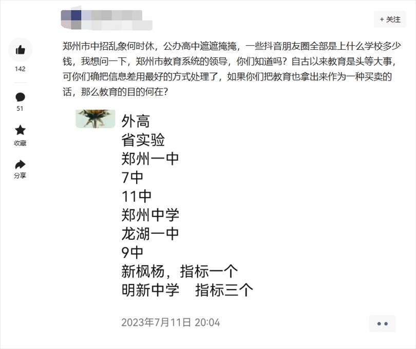 7月16日,有群眾通過頂端新聞“我想@領(lǐng)導”平臺向鄭州市教育局局長留言:“掏錢就能上?鄭州中招販賣名額成風”“公開賣高中名額,鄭州教育局都不管嗎”等類似留言。