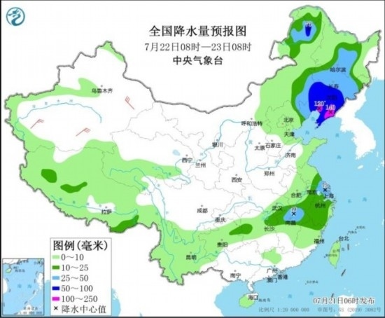 圖3 全國降水量預報圖(7月22日08時-23日08時)