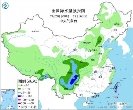 圖4 全國降水量預報圖(7月26日08時-27日08時)