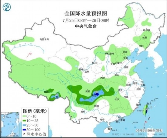 圖2 全國降水量預報圖(7月24日08時-25日08時)