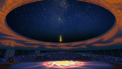 特效數(shù)字焰火與太陽(yáng)神鳥(niǎo)金芒旋轉(zhuǎn)倒計(jì)時(shí)融合,依次出現(xiàn)“12、11……1”的倒計(jì)時(shí)數(shù)字,隨后一朵金色芙蓉花綻放。