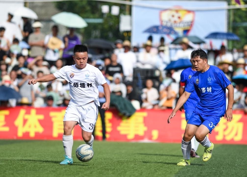7月15日,六佰塘村足球隊球員楊宗維(左)在與月寨村足球隊的比賽中帶球進(jìn)攻。新華社記者 楊文斌 攝