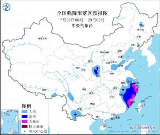 預(yù)計(jì),7月28日08時(shí)至29日08時(shí),江蘇南部、安徽南部、浙江、福建、江西東部以及甘肅東部、陜西中部、云南南部、河南北部、山東西北部和東南部等地的部分地區(qū)有大到暴雨,其中,浙江北部和東部、福建東部等地的部分地區(qū)有大暴雨,局地特大暴雨(250~280毫米)。上述部分地區(qū)伴有短時(shí)強(qiáng)降水(最大小時(shí)降雨量30~60毫米,局地可超過80毫米),局地有雷暴大風(fēng)等強(qiáng)對(duì)流天氣。中央氣象臺(tái)7月28日06時(shí)繼續(xù)發(fā)布暴雨橙色預(yù)警。