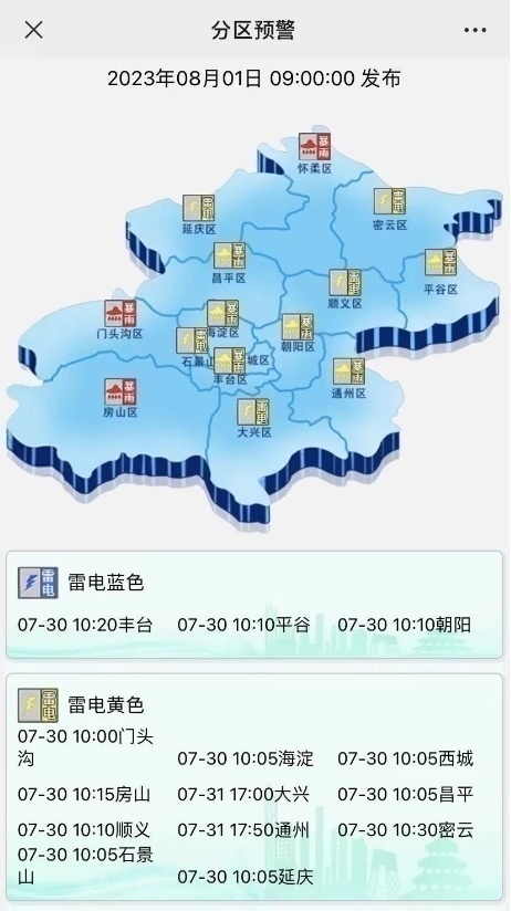 據(jù)氣象部門消息,北京發(fā)布暴雨分區(qū)預警:本市降雨趨于減弱,目前西部、北部地區(qū)仍處于暴雨紅色預警中,大部分區(qū)域降級為暴雨黃色預警信號,請注意做好防范。