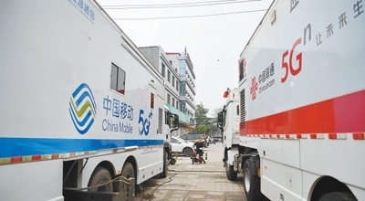 8月3日,應急通信車輛在河北涿州市第三中學安置點外保障通信。新華社記者 牟 宇攝