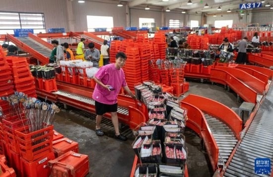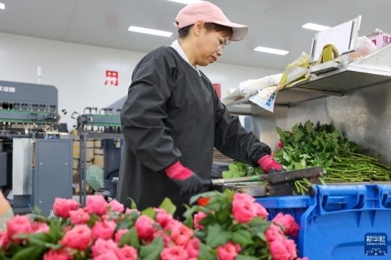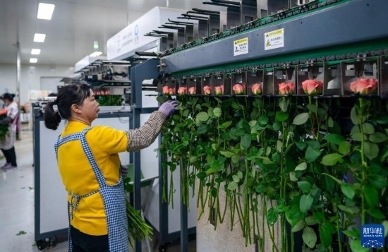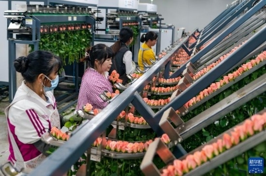在云天化晉寧花卉產(chǎn)業(yè)現(xiàn)代化示范園內(nèi),花農(nóng)們將預(yù)冷處理后的鮮花放入自動(dòng)分揀流水線(xiàn)(7月12日攝)。新華社記者 崔文 攝