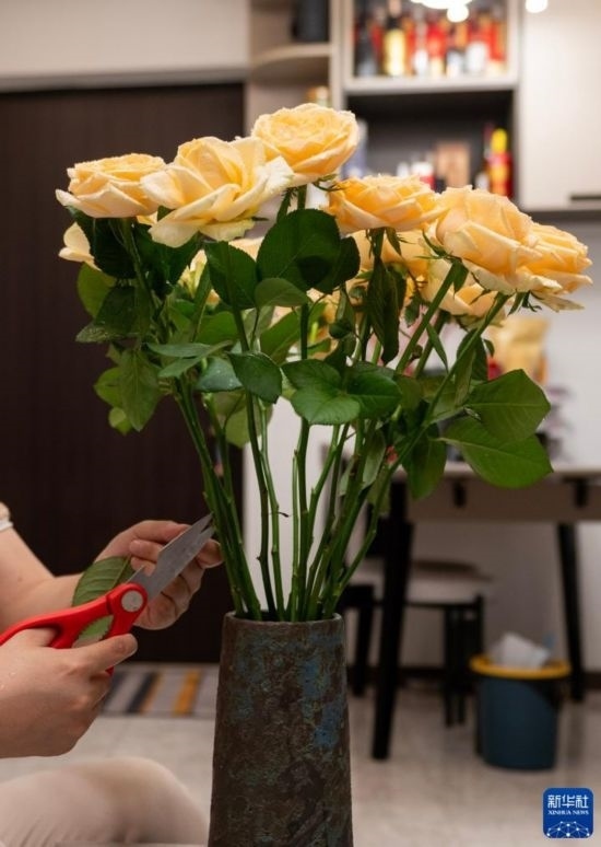 8月3日,一位昆明市民在家中修剪花枝。新華社記者 陳欣波 攝