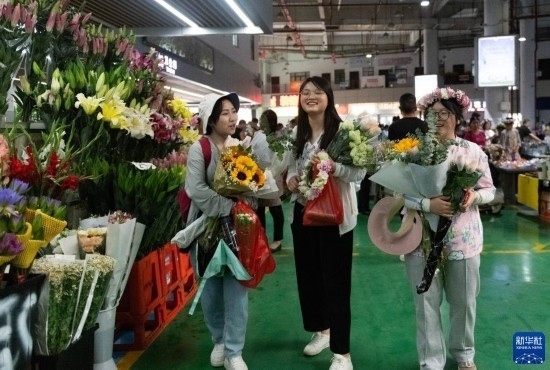 幾名外地游客在昆明斗南花卉市場(chǎng)內(nèi)購(gòu)買(mǎi)鮮花(7月13日攝)。新華社記者 陳欣波 攝