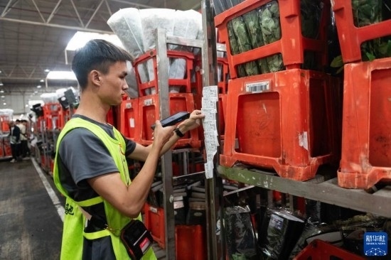 一名工作人員在昆明國(guó)際花卉拍賣(mài)交易中心內(nèi)對(duì)臺(tái)車(chē)上存放的鮮花進(jìn)行掃碼(7月13日攝)。新華社記者 陳欣波 攝