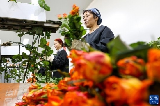 在云天化晉寧花卉產(chǎn)業(yè)現(xiàn)代化示范園內(nèi),花農(nóng)對(duì)鮮花進(jìn)行簡(jiǎn)單打包(7月12日攝)。新華社記者 陳欣波 攝