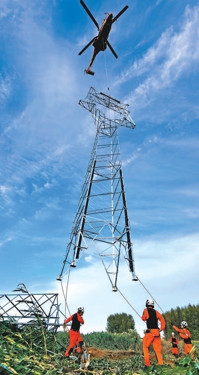 8月9日,國家電網(wǎng)公司調(diào)配直升機支援黑龍江電力恢復(fù)工作。圖為直升機在牡丹江海林110千伏海長線搶修現(xiàn)場整塔吊裝作業(yè)中。方 圓 張恩全攝影報道