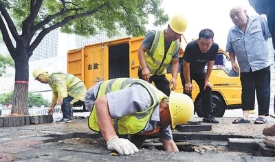 8月10日,河北省廊坊市市政人員搶修因暴雨破裂的管道。邵玉姿 孫寶宇攝影報道