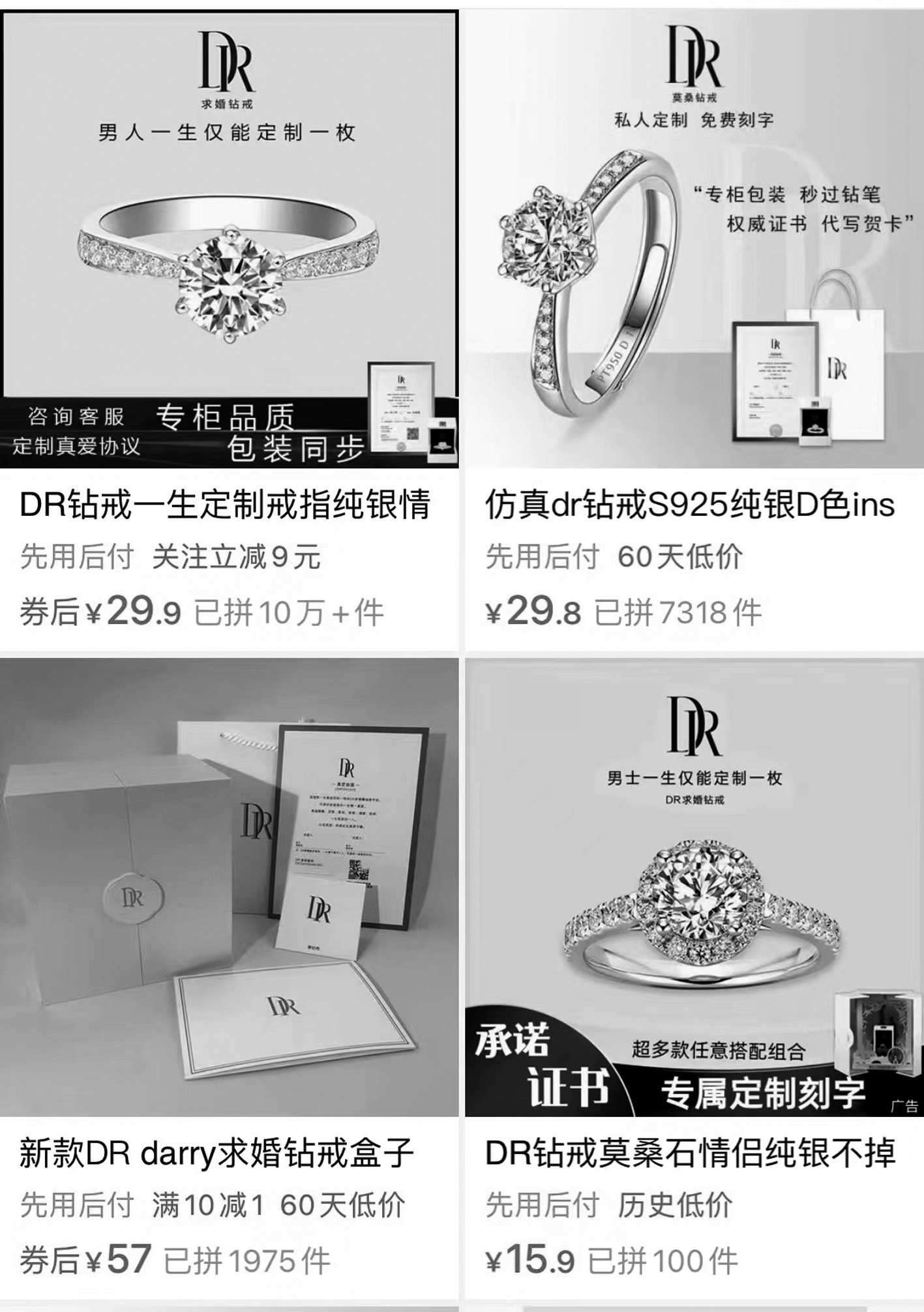 七夕將至,電商平臺上出現(xiàn)了一批“廉價求婚鉆戒”。幾十塊錢的“DR鉆戒”不僅可以定制配套的“真愛協(xié)議”,還能提供“珠寶鑒定證書”和“DR包裝盒”。揚子晚報/紫牛新聞記者調(diào)查發(fā)現(xiàn),這些商品的進貨價,可能只有個位數(shù)。