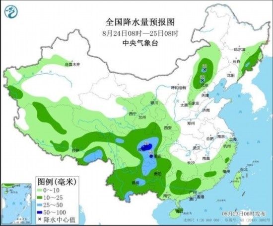 全國降水量預(yù)報圖(8月24日08時-25日08時)