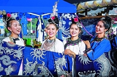 村民在貴州“村超”賽場(chǎng)旁的文創(chuàng)攤位展示民族服飾。新華社發(fā)