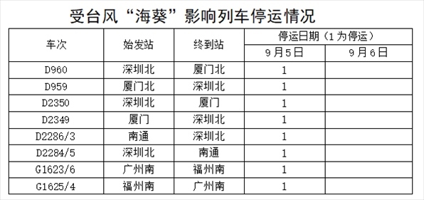 據(jù)中央氣象臺消息,今年第11號臺風(fēng)“??庇诮裉欤?月5日)早晨5點(diǎn)20分前后在福建省東山縣沿海登陸,福建東部部分地區(qū)將有大暴雨,并伴有短時(shí)強(qiáng)降水,局地有雷暴大風(fēng)等強(qiáng)對流天氣。為防范臺風(fēng)影響,保障鐵路運(yùn)輸安全,中國鐵路南昌局集團(tuán)有限公司繼續(xù)調(diào)整部分旅客列車運(yùn)行方案,停運(yùn)管內(nèi)途經(jīng)杭深線福州南至詔安,龍漳線龍巖至漳州,昌福線三明北至福州等區(qū)段旅客列車。同時(shí),加開15趟旅客列車,方便旅客出行。