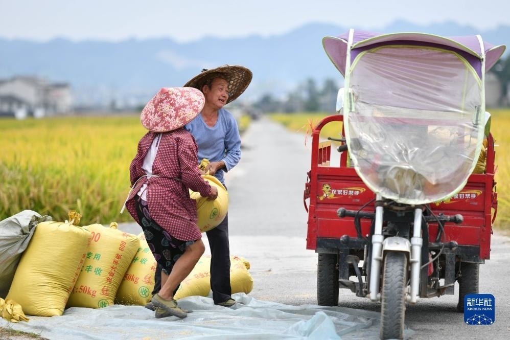 9月6日,村民在貴州省黔東南苗族侗族自治州黃平縣舊州鎮(zhèn)萬畝大壩搬運(yùn)剛收獲的稻谷。