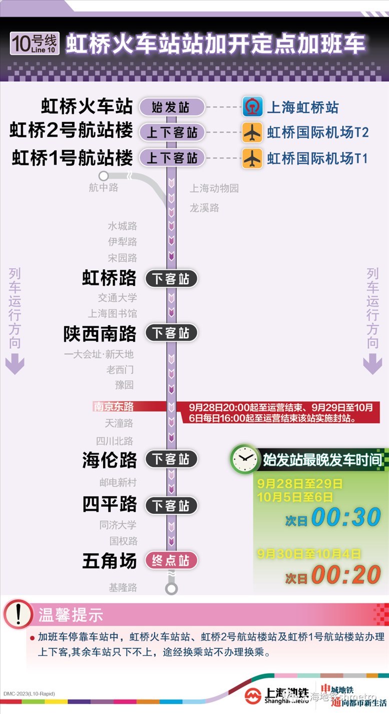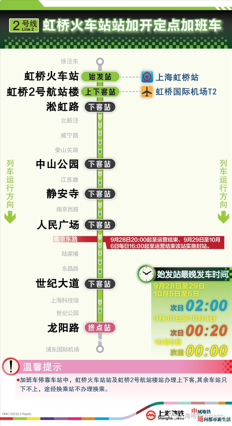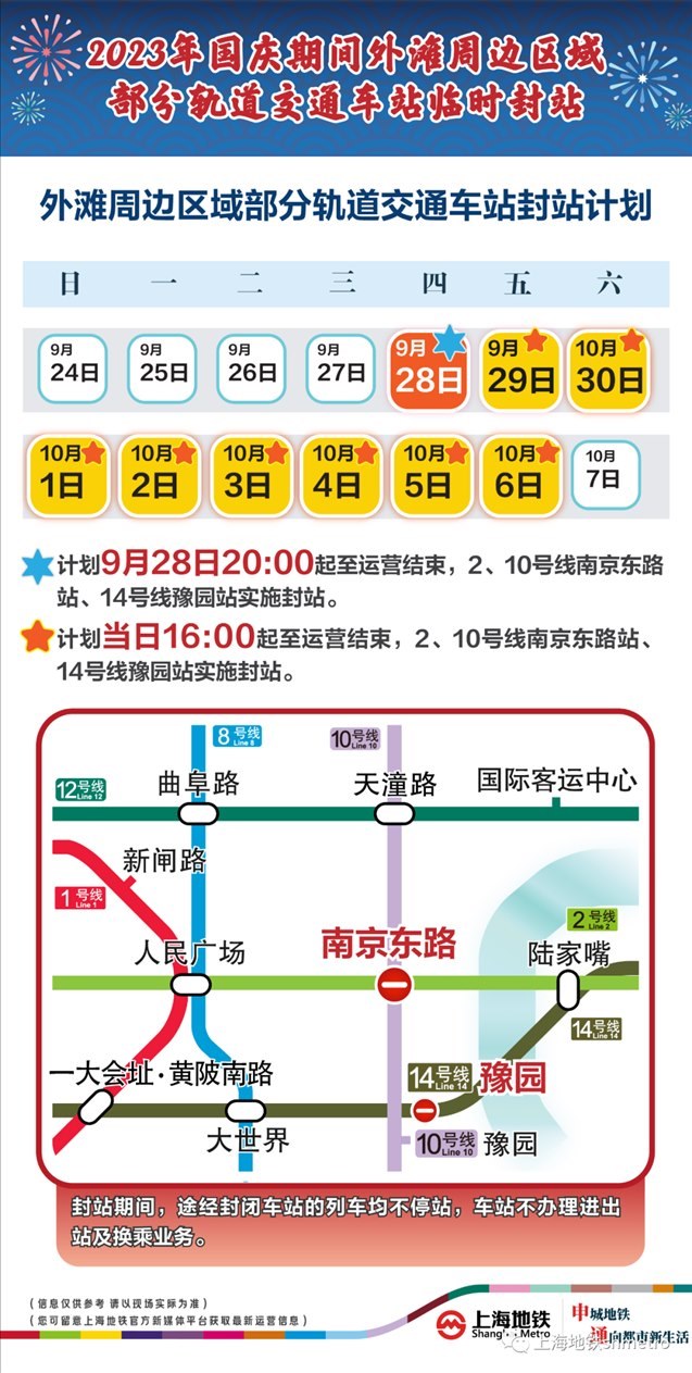 此外,9月28日20:00至運(yùn)營結(jié)束,以及9月29日至10月6日的每日16:00至運(yùn)營結(jié)束,地鐵2、10號線南京東路站,14號線豫園站計劃實(shí)施封站跳停。