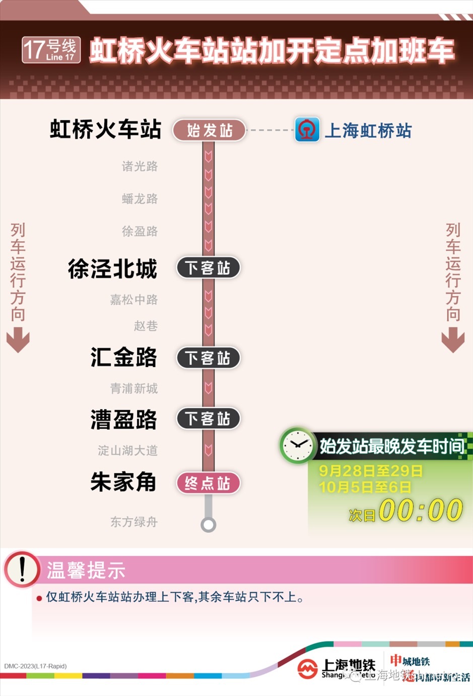 根據(jù)鐵路虹橋站夜間到達(dá)列車開行情況,9月28日、9月29日、10月5日、10月6日,鐵路在原夜間圖定計劃的基礎(chǔ)上增加了開行班次。為應(yīng)對鐵路臨時加開,做好虹橋火車站夜間列車集中到達(dá)大客流疏散工作,虹橋樞紐相關(guān)的地鐵2、10、17號線在既定延時或加開方案的基礎(chǔ)上進(jìn)一步增開定點(diǎn)加班車。其中,9月28日至29日、10月5日至6日夜間,虹橋火車站定點(diǎn)加班車最晚發(fā)車時刻為:2號線至次日2:00、10號線至次日0:30、17號線至次日0:00。同時,9月30日至10月4日,2號線和10號線虹橋火車站定點(diǎn)加班車發(fā)車時刻推遲至次日0:20。