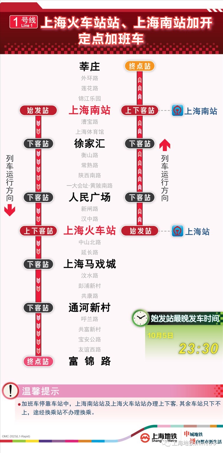 此外為做好節(jié)假日返程期間上?;疖囌?、虹橋火車站、上海南站的夜間客流疏散工作,10月5日,地鐵1號線在圖定基礎(chǔ)上實(shí)施定點(diǎn)加開方案,加開末班車發(fā)車時間至23:30;另10月8日地鐵2號線增加定點(diǎn)加班車班次,加開末班車發(fā)車時間至次日0:00。