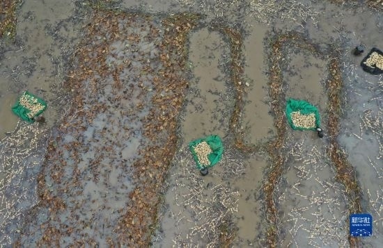 10月5日,河北省新河縣西流鄉(xiāng)西董村一家蓮藕種植合作社的社員在收獲蓮藕(無(wú)人機(jī)照片)。