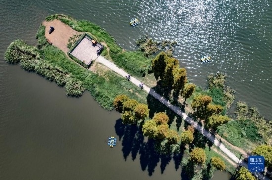 10月6日,市民在由滇池綠道串聯(lián)的干尾溝濕地公園游覽(無人機照片)。