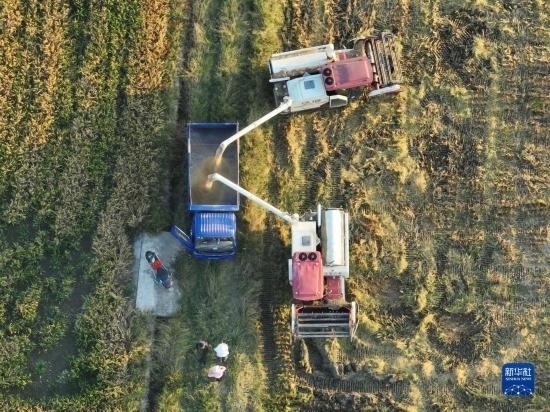 10月18日,湖南省衡陽市衡山縣白果鎮(zhèn),農(nóng)民在收割晚稻(無人機(jī)照片)。