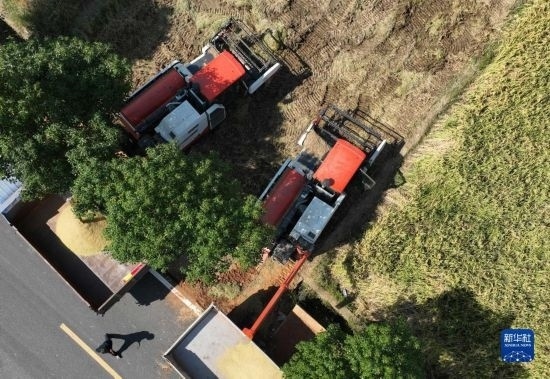 10月18日,湖南省衡陽市衡山縣白果鎮(zhèn),農(nóng)機(jī)手駕駛收割機(jī)搶收晚稻(無人機(jī)照片)。
