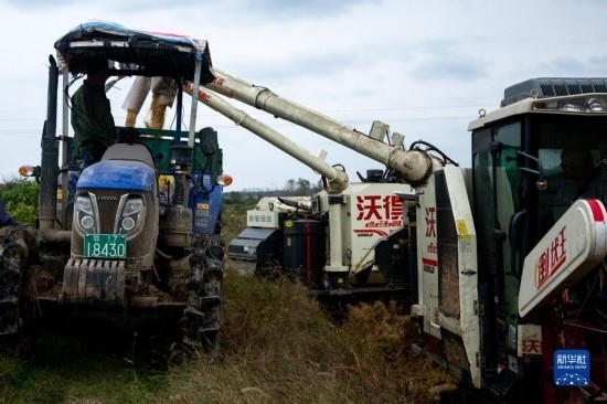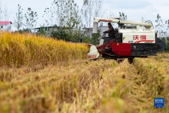 在湖北省天門市石家河鎮(zhèn)唐店村,農(nóng)民操作農(nóng)機(jī)收割水稻(10月19日攝)。