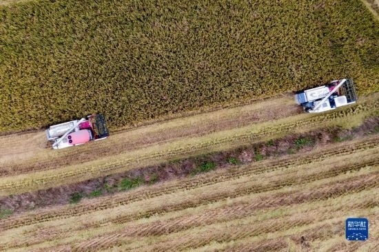 在湖北省天門市石家河鎮(zhèn)唐店村,農(nóng)民操作農(nóng)機(jī)收割水稻(無人機(jī)照片,10月19日攝)。