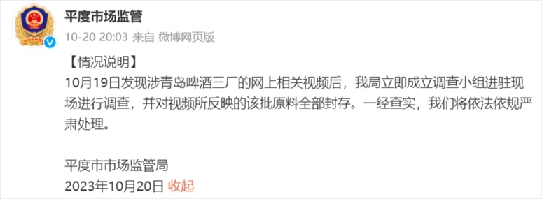 青島啤酒方面在10月20日晚間發(fā)布的回應(yīng)稱,針對10月19日網(wǎng)上出現(xiàn)的青島啤酒三廠的相關(guān)視頻,公司高度重視,第一時間向公安機(jī)關(guān)報警,公安機(jī)關(guān)已介入調(diào)查。目前,該批麥芽已經(jīng)全部封存。公司繼續(xù)加大管理力度,確保產(chǎn)品質(zhì)量,歡迎廣大消費(fèi)者監(jiān)督。
