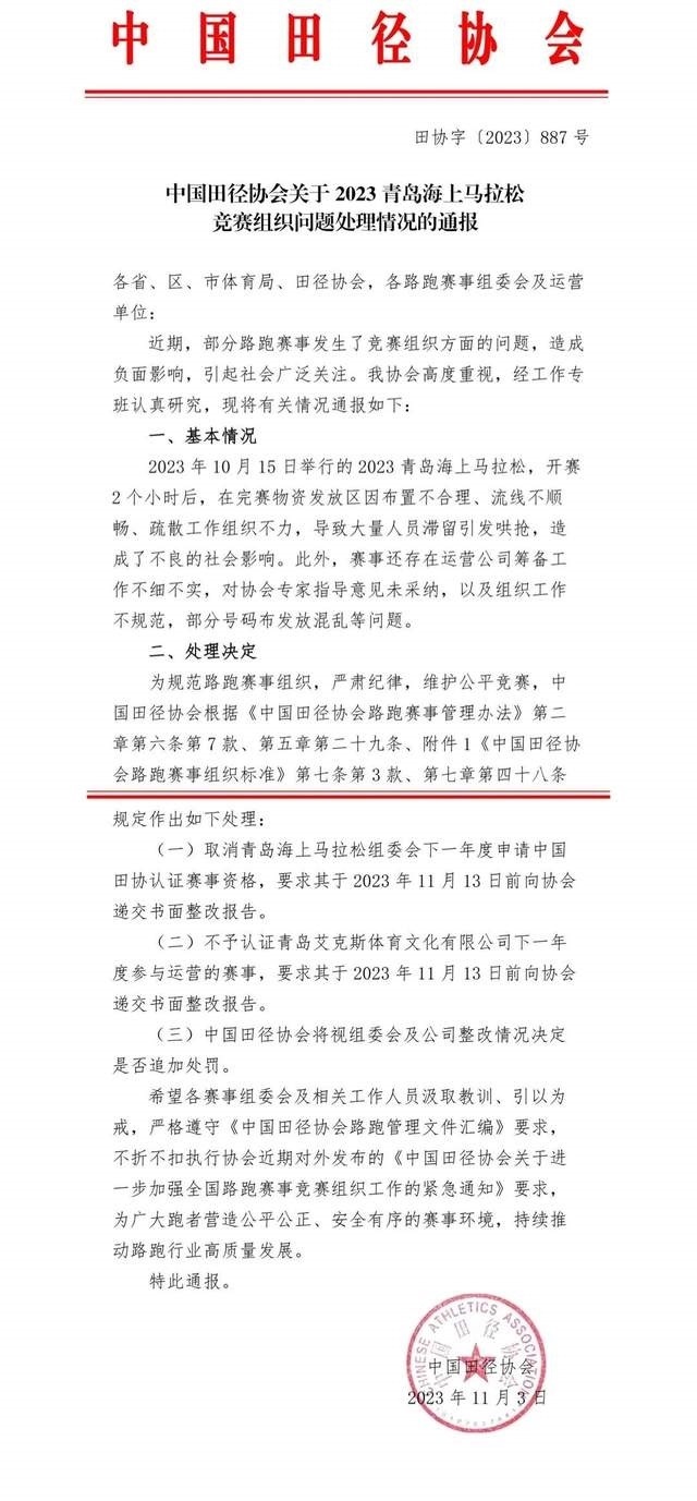 央視網(wǎng)消息:據(jù)“中國(guó)馬拉松平臺(tái)”官微消息,近日,部分路跑賽事出現(xiàn)了一些競(jìng)賽組織問(wèn)題,引發(fā)社會(huì)廣泛關(guān)注,造成了不良的社會(huì)影響。中國(guó)田徑協(xié)會(huì)高度重視、全面調(diào)查,依據(jù)事實(shí)和路跑賽事管理規(guī)定,從加強(qiáng)競(jìng)賽組織,壓實(shí)各方主體責(zé)任,提示行業(yè)風(fēng)險(xiǎn)隱患的角度,對(duì)相關(guān)單位和人員進(jìn)行了相應(yīng)處理?,F(xiàn)將處理情況通報(bào)如下: