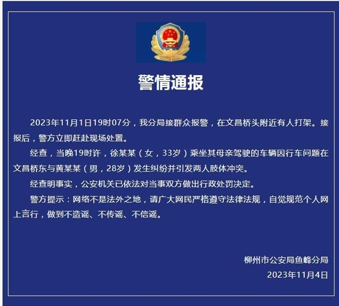 ·柳州警方通報(bào)女子疑路怒咬掉男子一塊肉:行車糾紛引發(fā)肢體沖突,對(duì)雙方做出行政處罰。