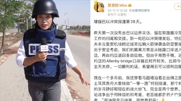戰(zhàn)地女記者陳慧慧稱將回撤:愿沖突早日結(jié)束,愿世界和平!11月3日,報(bào)道巴以沖突的中央廣播電視總臺(tái)女記者陳慧慧上了熱搜。10月9日她在前線發(fā)回第一篇報(bào)道,到4日為止她已經(jīng)在戰(zhàn)地堅(jiān)持了整整28天。