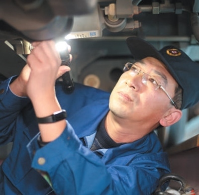 時(shí)而膝蓋微弓,腰部略彎;時(shí)而敲敲打打,上前細(xì)嗅……只見劉波進(jìn)車廂、鉆車底、登車頂,對(duì)列車逐一進(jìn)行檢查,不一會(huì)兒,動(dòng)車隱患就被及時(shí)發(fā)現(xiàn)并排除。