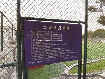 賢園足球場的“場地使用須知”牌。從上面羅列的條款得知,該球場僅中午12時(shí)至下午2時(shí)是公益免費(fèi)開放時(shí)段。?