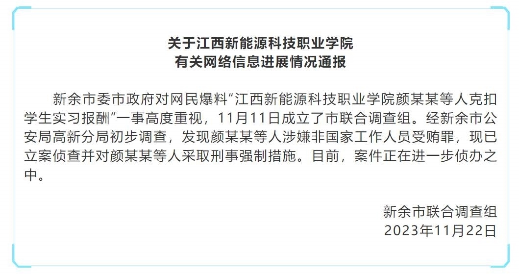 ·江西新余通報一職校被舉報克扣學(xué)生實習(xí)報酬:多人涉嫌受賄被控制。