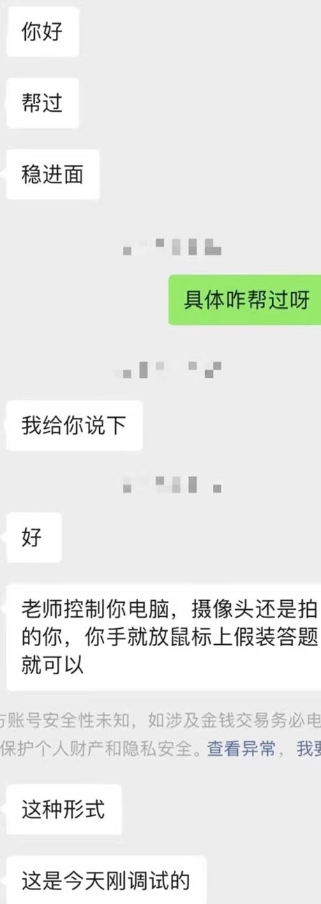“老師(遠程)控制你的電腦,你手放在鼠標(biāo)上假裝答題就可以?!?/p>