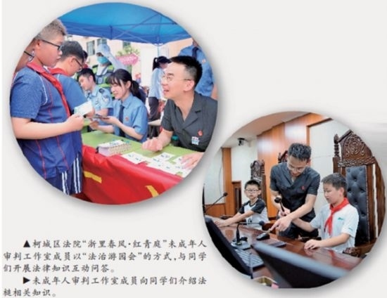 “‘紅青庭’品牌Logo中,‘紅’字既突出黨建統(tǒng)領又寓意紅領巾,是百折不撓的精神象征;‘青’字代表著青少年,是肩負未來的青春力量;‘庭’字則是指少年法庭和家庭?!焙l(wèi)民介紹,柯城區(qū)法院依托“浙里春風·紅青庭”品牌,成立青少年法治教育實踐基地和未成年人審判工作室,積極開展內(nèi)外聯(lián)動,在持續(xù)加強涉未成年人刑事、民事、行政審判融合的基礎上,不斷深化與公安、檢察、教育、團委、婦聯(lián)等部門的協(xié)調(diào)配合,構(gòu)筑全方位、多鏈條的綜合司法保護機制。