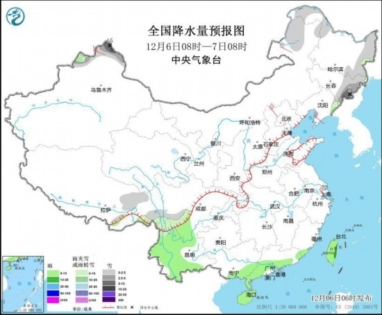 12月6日08時(shí)至7日08時(shí),內(nèi)蒙古東北部、黑龍江西北部和東部、吉林東部、遼寧東部、新疆北疆北部和北疆東部、西藏東部、川西高原南部、云南西北部等地部分地區(qū)有小到中雪或雨夾雪,其中,吉林東部、新疆北疆北部等地局地有大到暴雪(10~15毫米)。四川南部、云南大部、廣西東南部、廣東南部、海南島、臺(tái)灣島等地部分地區(qū)有小雨,其中,臺(tái)灣島東部局地有中雨。內(nèi)蒙古東北部、遼東半島、新疆北疆北部、華北北部、浙江東部等地部分地區(qū)有4~6級(jí)風(fēng)。