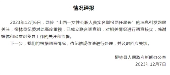 ·山西女子實(shí)名舉報(bào)兩任局長(zhǎng)受賄玩弄女性,柳林縣紀(jì)委:已經(jīng)成立聯(lián)合調(diào)查組。