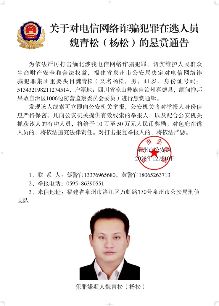 為依法嚴(yán)厲打擊緬北涉我電信網(wǎng)絡(luò)詐騙犯罪,切實維護(hù)人民群眾生命財產(chǎn)安全和合法權(quán)益,遼寧省大連市公安局決定對白所成、白應(yīng)蒼(又名李云晨)、白應(yīng)蘭(又名李夢娜)進(jìn)行公開懸賞通緝;福建省泉州市公安局決定對魏懷仁、魏榕(又名陳榕)、魏青松(又名楊松)進(jìn)行公開懸賞通緝;福建省龍巖市公安局決定對劉正祥、劉積光(又名李華光)、劉正茂進(jìn)行公開懸賞通緝;重慶市公安局決定對徐老發(fā)(又名徐發(fā)啟)進(jìn)行公開懸賞通緝。